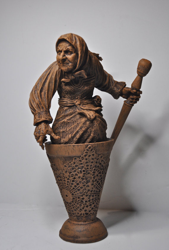 I have a long-standing fascination with Baba Yaga. I first encountered this Eastern European folkloric character at the tender age of seven. There was a hut in the woods near my school which, I was told, was her house. Naturally, this terrified me, but I was an odd child, and thrived on fear. I’m utterly enchanted by this Baba Yaga Sculpture made out of resin by Michael Locascio of Dellamorteco.
