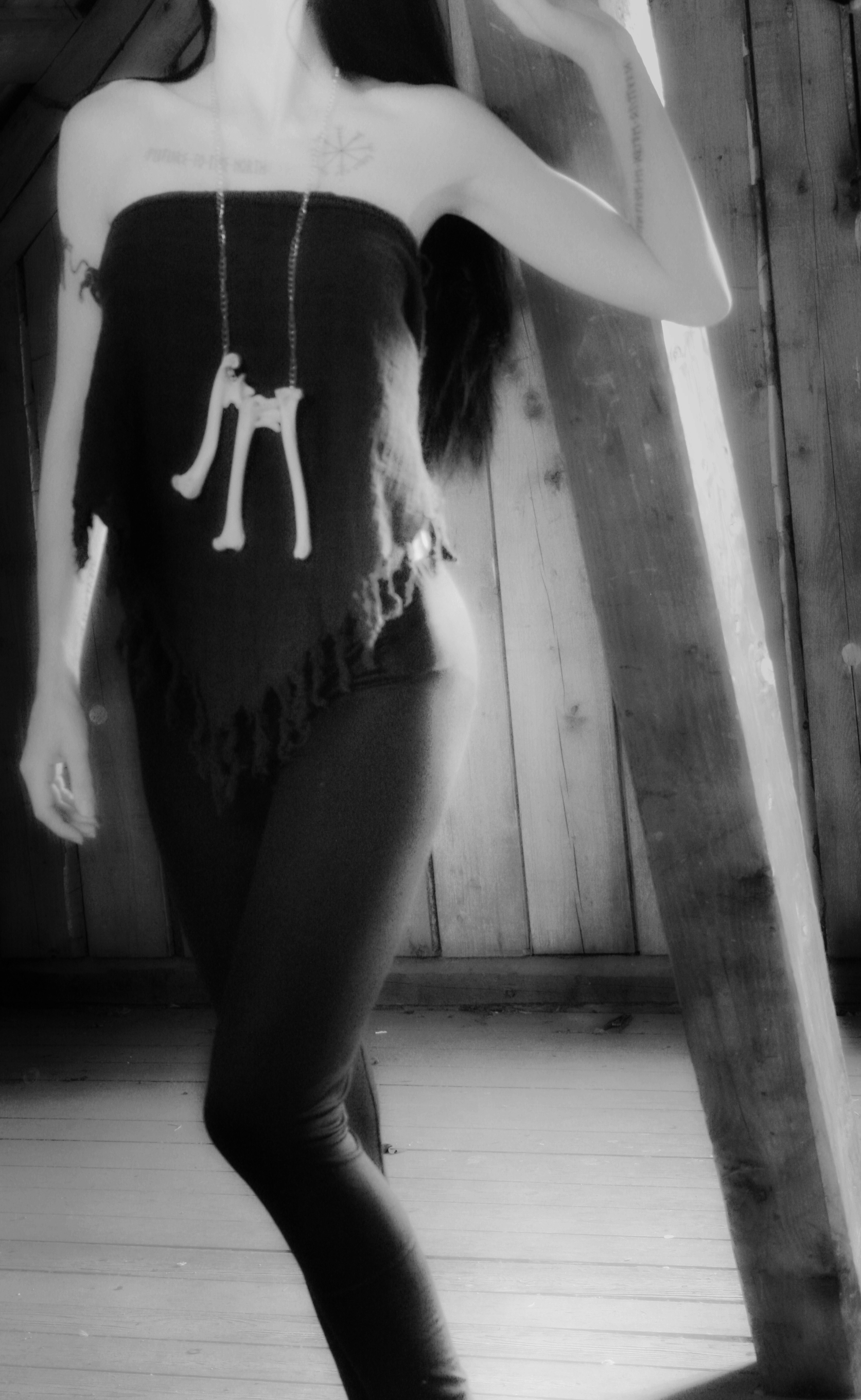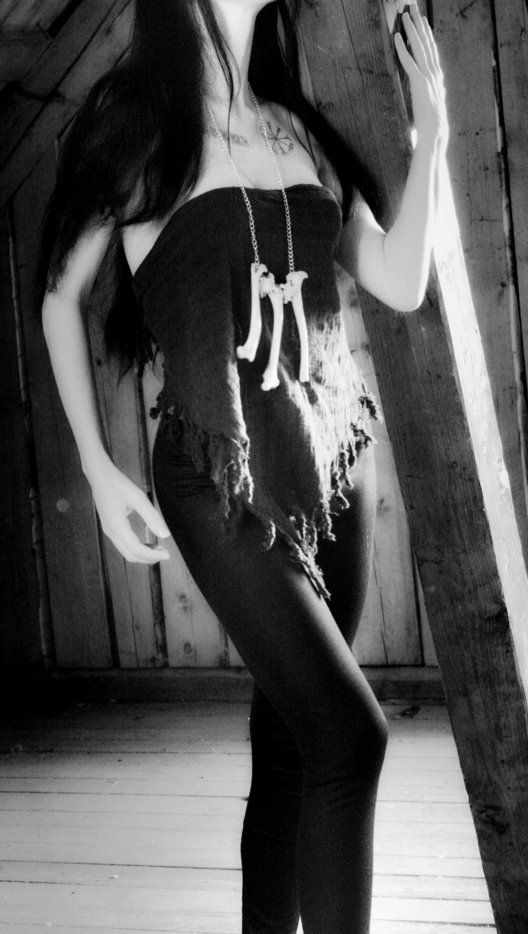 The top I’m wearing has been fashioned from an old scarf and necklace is handmade by myself out of fox bones and silver chain.