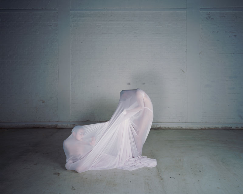 “It is an introspective examination of confrontation, entanglement, coexistence and contradictions. A male and a female body move under the white cloth. Rather than emphasizing gender difference, the bodies seem to be governed by mystical force and tension, indicating a sort of yin/yang co-dependence that underlies the basis of life.” – Jiang Zhi