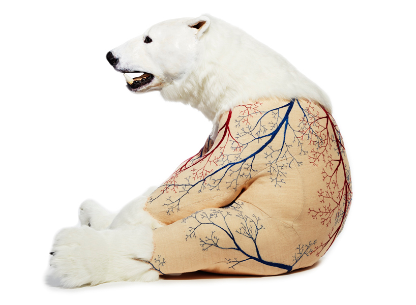 Deborah Simon has created a series of bear sculptures which look exactly like the real things…except for their coats which have been embellished with hand-stitched organ systems.