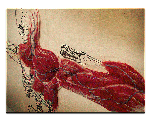 The latest artwork to catch by eye is a mixed media series titled ‘Systems.’ US based artist Dan Beckemeyer combined a highly detailed illustration of a human skeleton with a stitched cardiovascular system and hand-felted muscle mass.