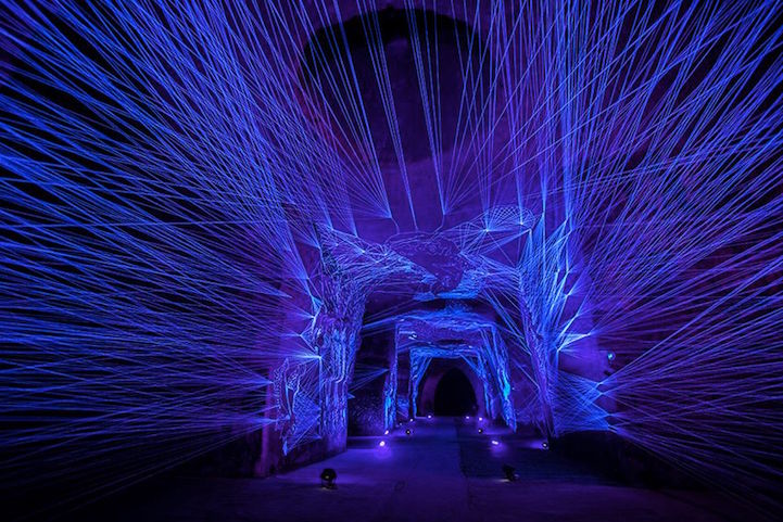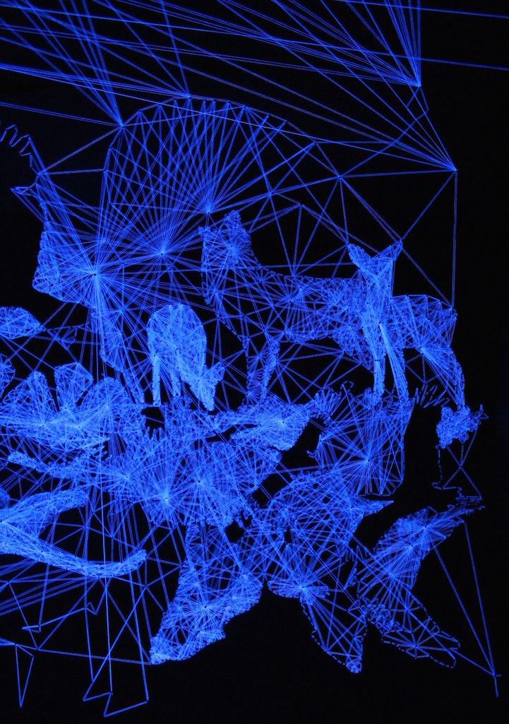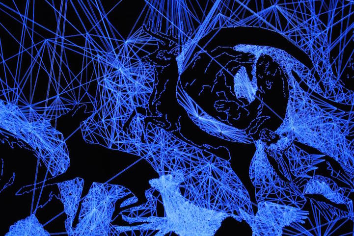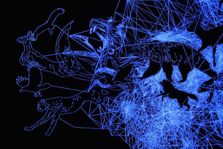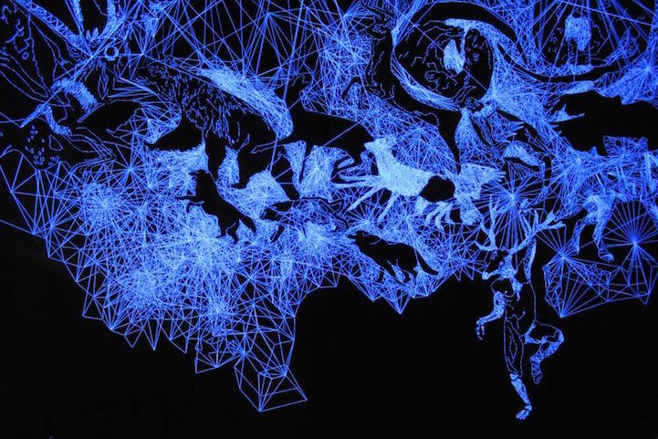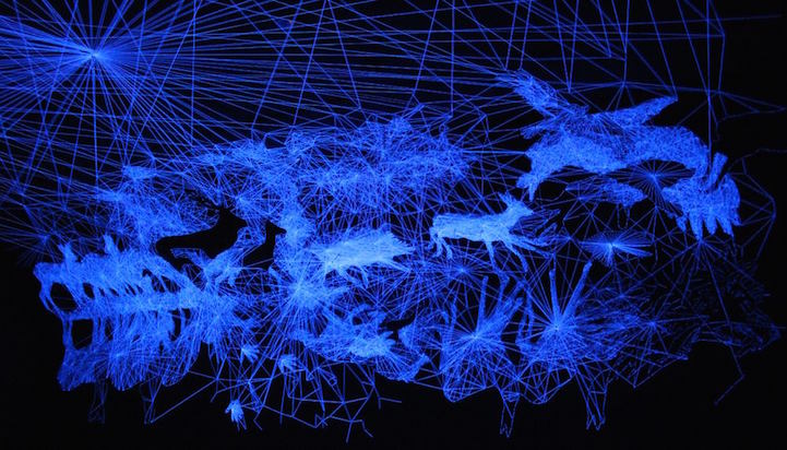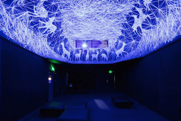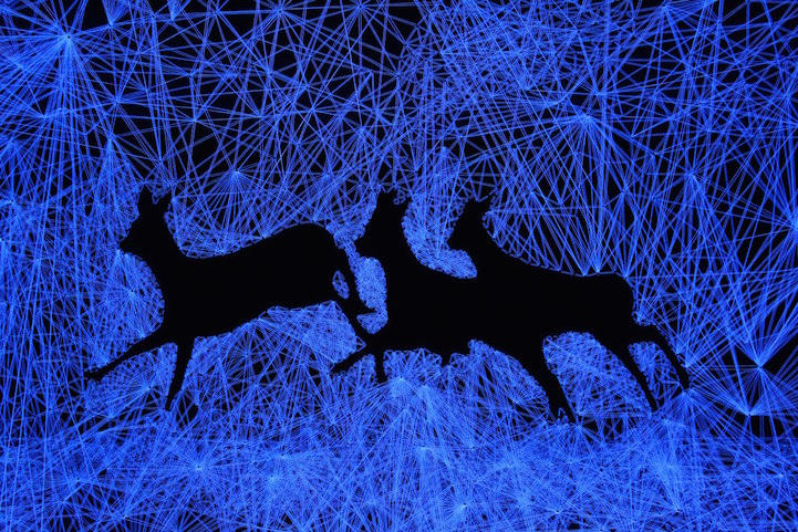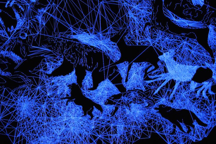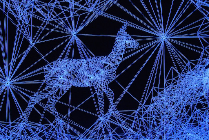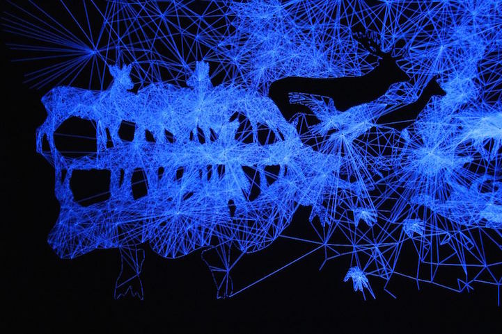 French artist Julien Salaud has created an installation as part of his Stellar Cave series which is unlike anything I have seen before. Salaud used cotton thread coated in ultraviolet paint and thousands of nails, to craft intricate and utterly breathtaking representations of creatures including deers, bears and wolves. What makes this installation even more enchanting, is that when the viewer looks up, it is as thought they are peering at at a part of the night sky, and the creatures, in their geometric formations, appear like constellations.