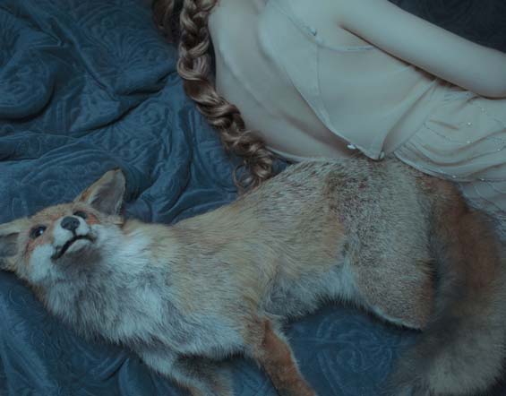 “My [photographs] are like screenshots from beautiful but cruel fairy tales. Their narrations are not straight. Images that appear are more like feelings that come during a lecture of an old folk-based story – full of witchcrafts and retributions. The structure of my works is similar to the structure of a dream where natural tendencies of collecting and organizing impulses and motivations coincide with irrational clashes of objects and feelings. Isolation and wounds are closed into patterns, uneasy and artificial orders – visual spells created in order to divide beastliness from humanity and dreams from horror.” – Laura Makabresku
