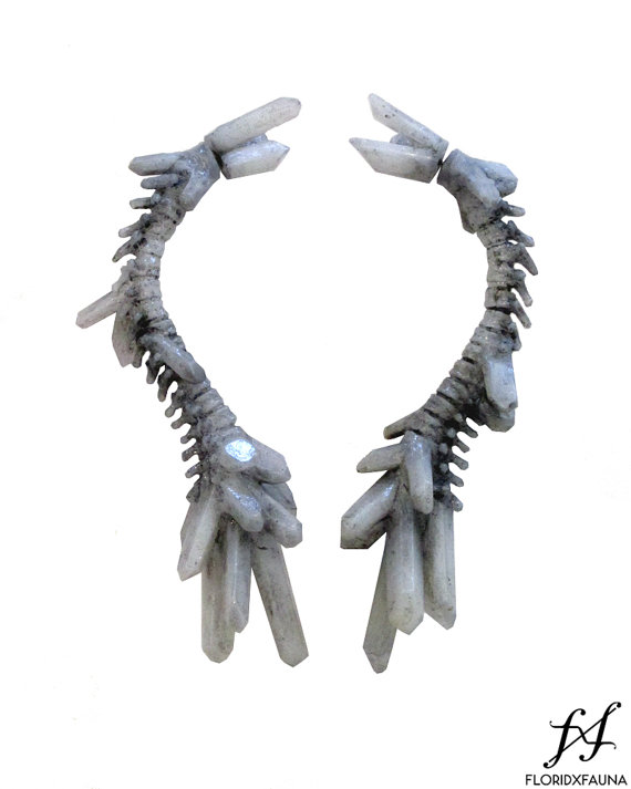 I’ve been an admirer of the dark jewellery offerings from FloridXFauna for quite some time now, and have been utterly bewitched by her most recent creations – Crystal Vertebrae Earrings, Saber Tooth Cat with Cascading Crystals Earrings and the Radiating Skull Earrings.