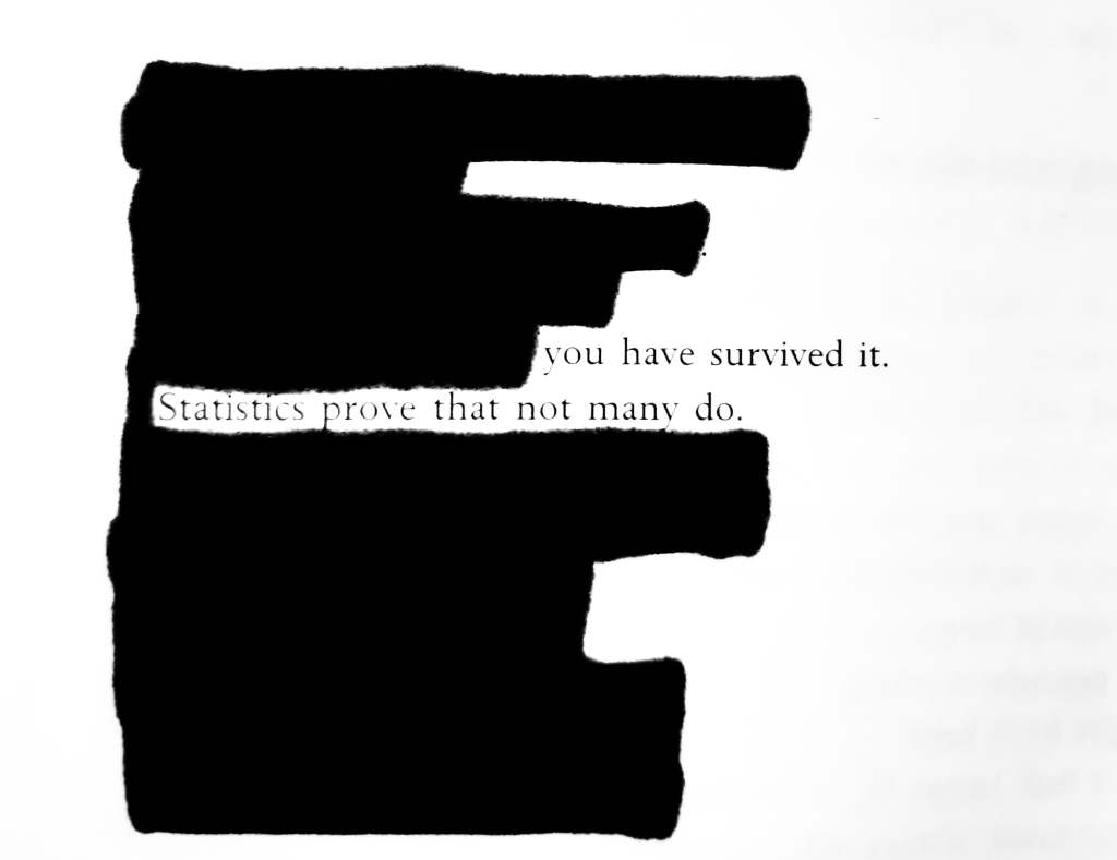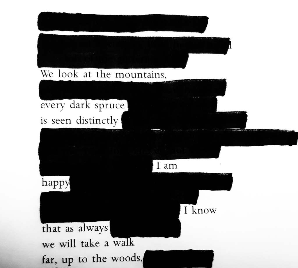 […] Blackout poetry. It was Austin Kleon who inspired me to try this. His blackout poetry is fucking exceptional. My blackout poetry is not. But it helped me feel something again. I recommend it, especially if youβre depressed.Β […]
